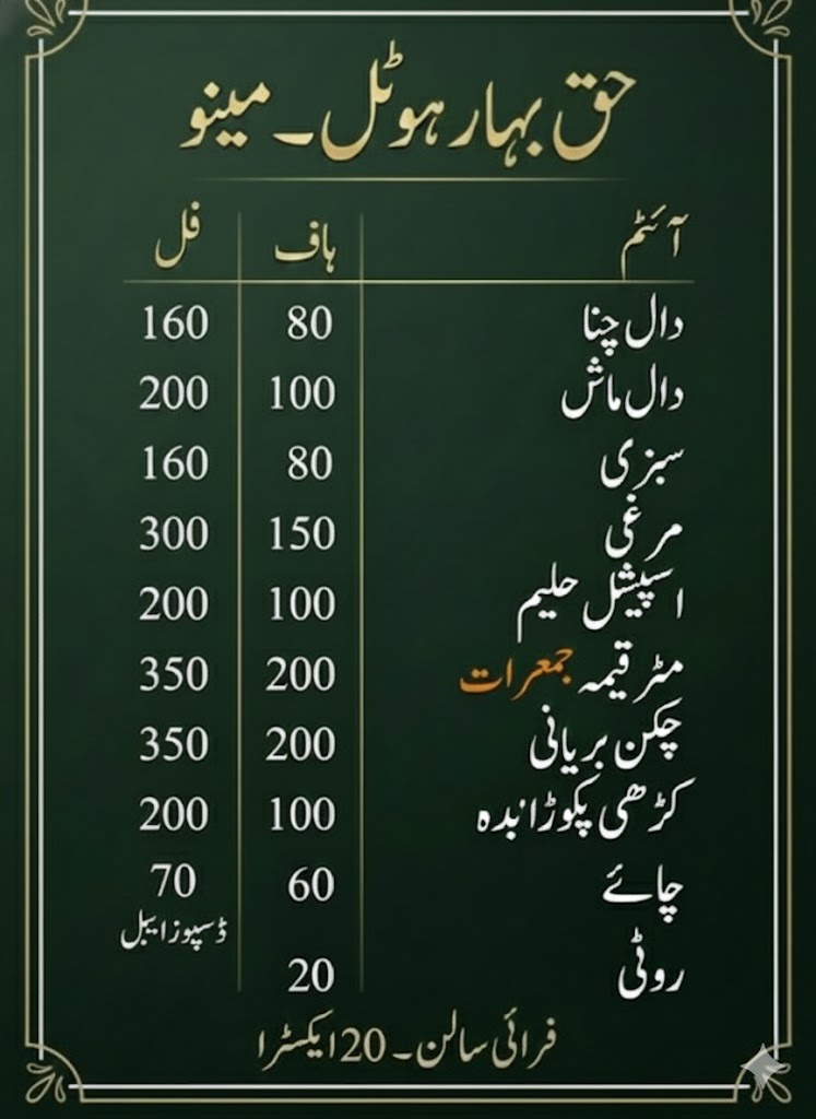 Welcome to Haqbahu Hotel, where we serve authentic village-style meals with the warmth and hospitality that reminds you of home. Established and personally managed by Chaudhry Aslam, our hotel has been a beloved part of the community for years.